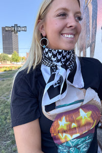 Classic meets cowgirl with the Howdy Houndstooth Wild Rag. Sleek, bold, and endlessly versatile; tie it up and let the pattern do the talking!
